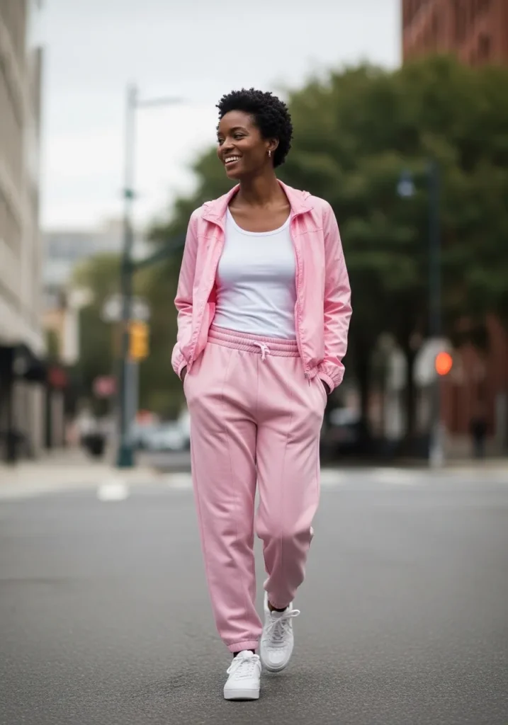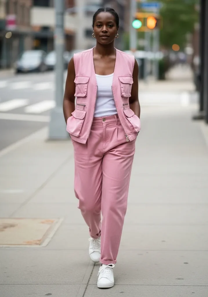This look features a pink vest layered over a matching top with coordinating pants and sneakers. The vest adds structure while the rest of the outfit stays relaxed. The pink tones keep it fun and cohesive.