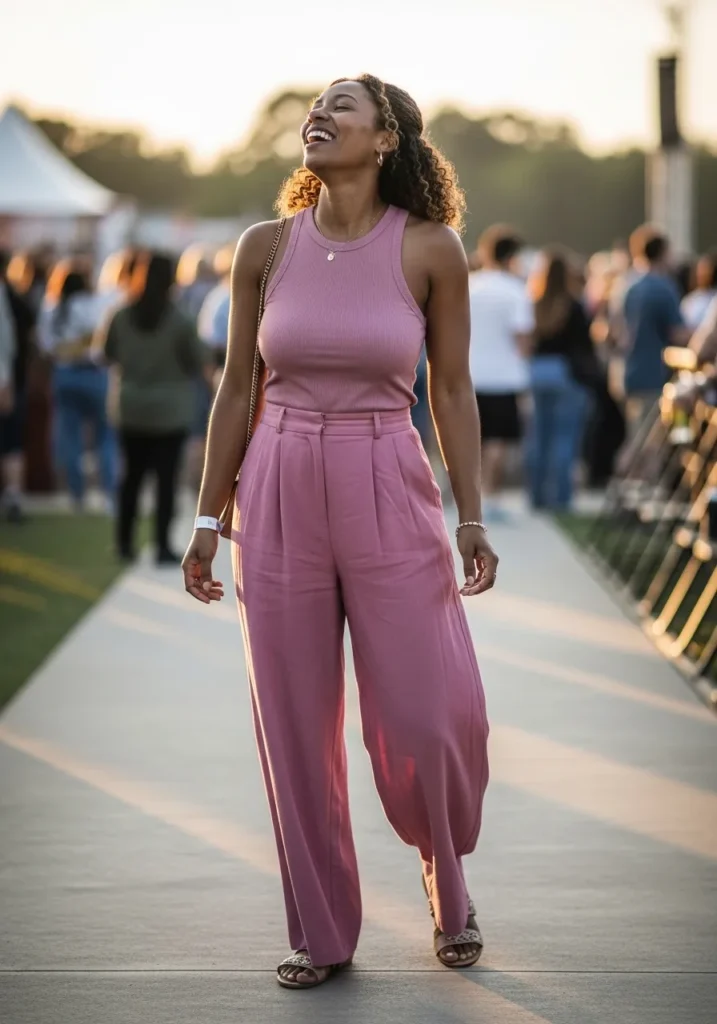 This look showcases a sleeveless pink jumpsuit with wide legs and a relaxed fit that allows plenty of movement. The fabric looks lightweight and breathable, making it ideal for crowded venues. The silhouette feels flattering while still being practical.