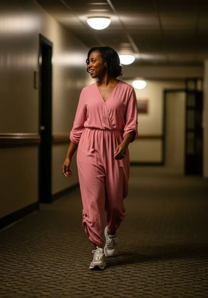 This outfit features a relaxed pink tunic top styled with matching pink leggings and sneakers. The fabric looks stretchy and forgiving, ideal for long nights on your feet. The monochrome pink keeps it cohesive and stylish even in low light.