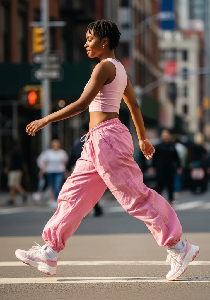 This look features pink cargo pants styled with a fitted pink tank top and sneakers. The pants look roomy and flexible while the top keeps the look balanced. The overall vibe feels cool, modern, and movement friendly.