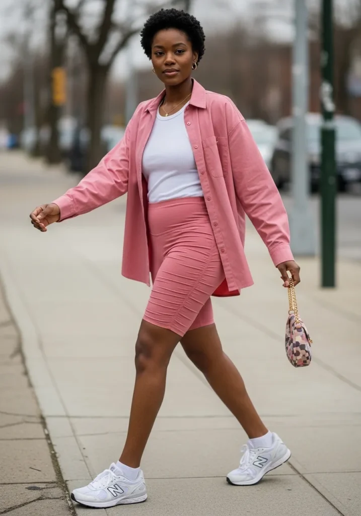 This outfit features a soft pink button up shirt layered over a pink top and bike shorts. The fabrics look light and stretchy, perfect for active nights. Sneakers complete the look for comfort.