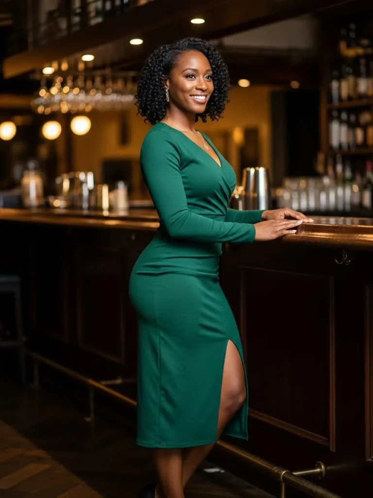 This outfit features a deep green midi dress with long sleeves, a flattering wrap style top, and a subtle side slit. The fabric is smooth and structured, creating a polished look that still feels perfect for a club or lounge setting.