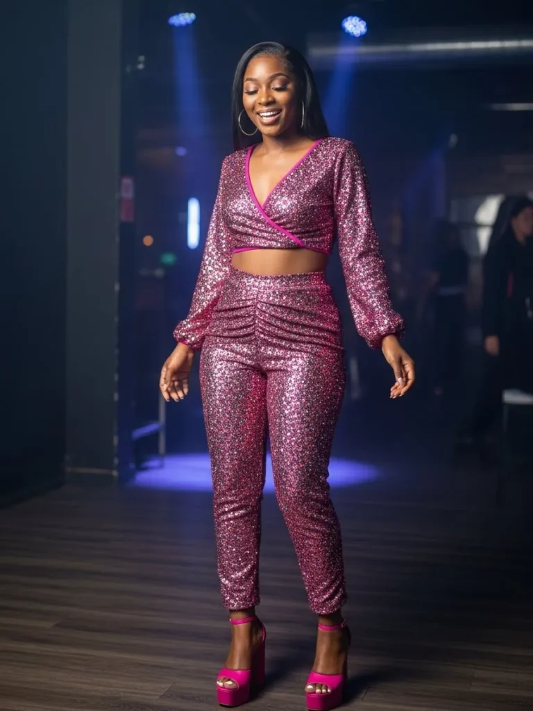 This outfit combines a shimmering fitted top with structured black pants for a perfect balance of glam and cool. The sparkle catches the club lights while the darker bottoms keep the overall look sleek and grounded.