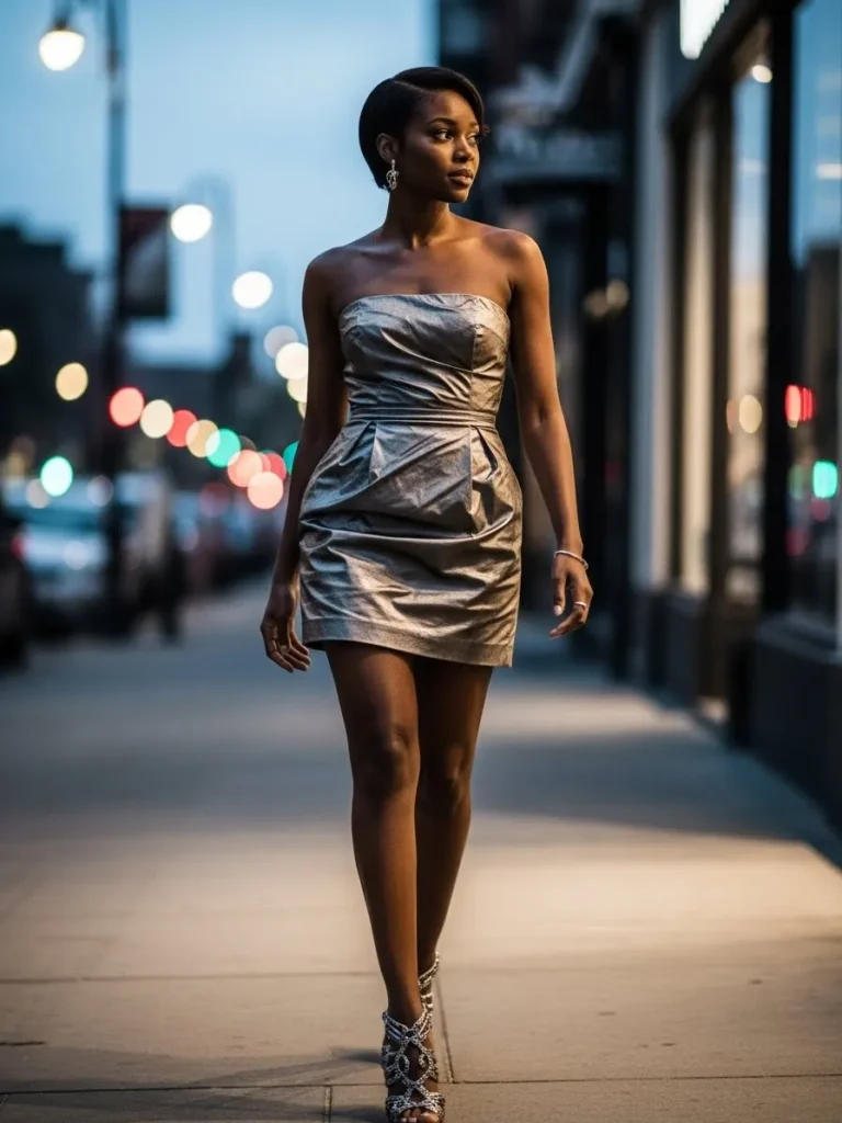 This look centers around a strapless metallic mini dress with soft draping and a subtle sheen. The structured bodice and glossy fabric give it a bold edge that stands out perfectly under city lights.
