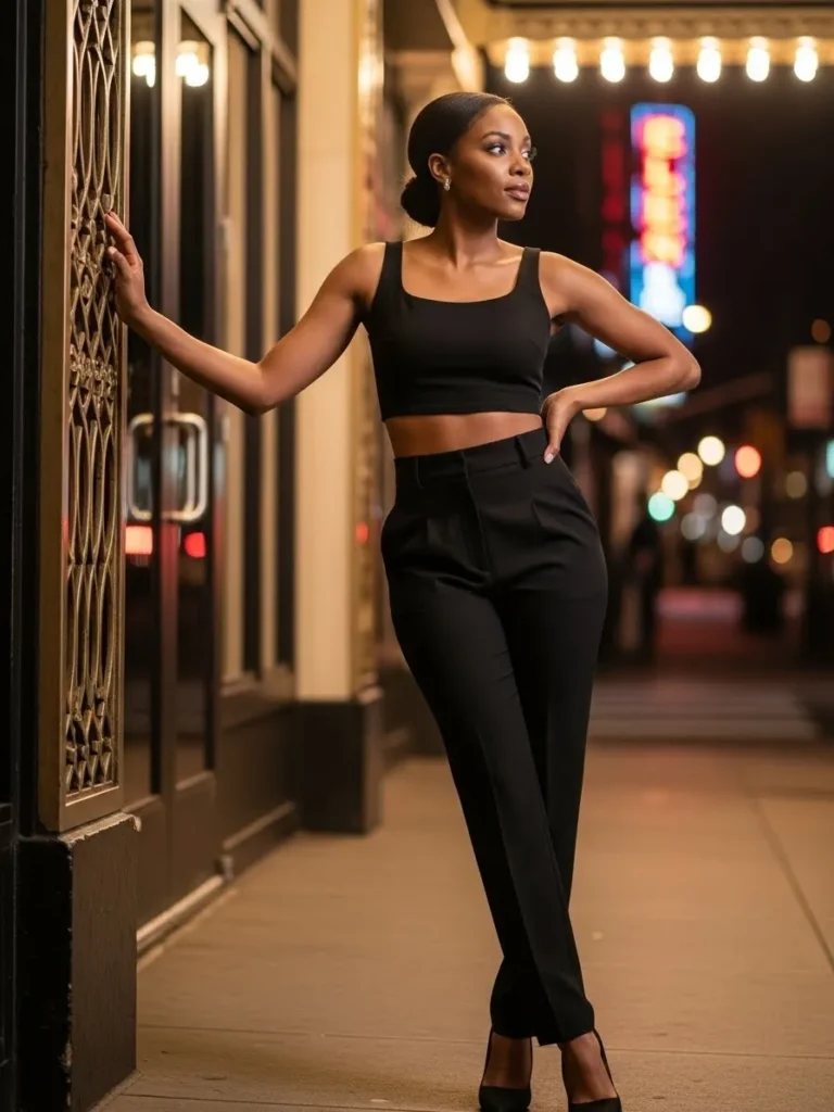 This outfit pairs a sleek black crop top with high waisted tailored black pants and pointed heels. The clean lines and fitted shape create a strong silhouette that feels modern and effortlessly cool.