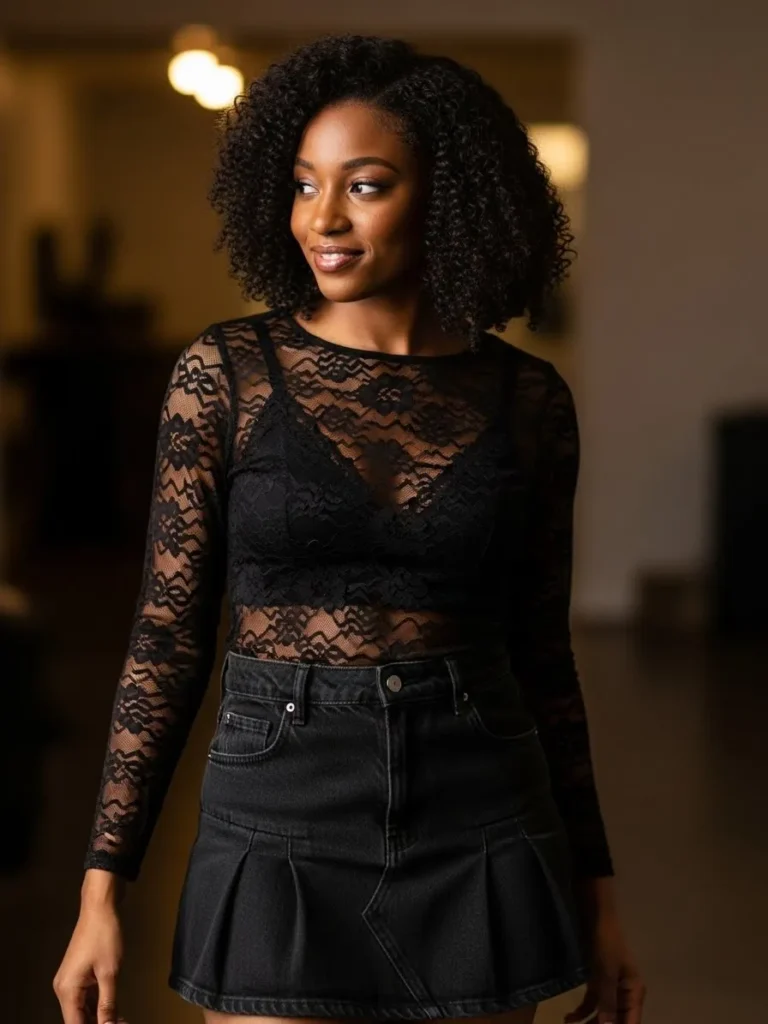 This outfit combines a sheer black lace long sleeve top with a structured black mini skirt. The mix of delicate lace and crisp denim or structured fabric creates a flirty yet balanced night out look.