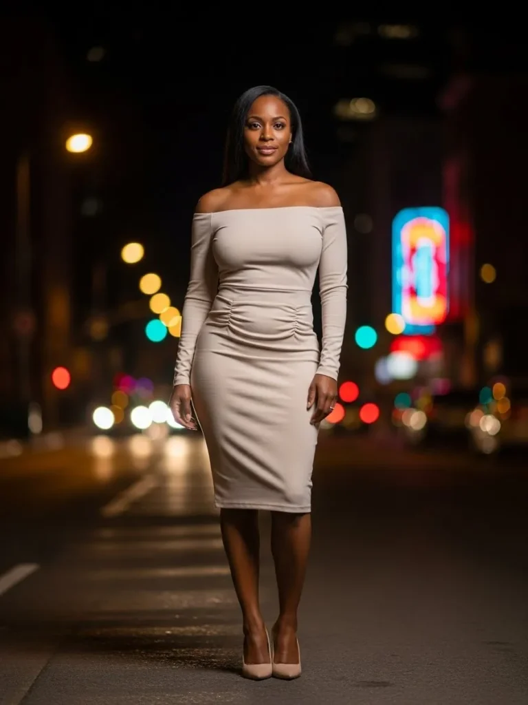 This look features an off the shoulder beige midi dress with subtle ruching and a fitted silhouette. The neutral tone keeps it classy while the neckline adds just the right amount of drama.
