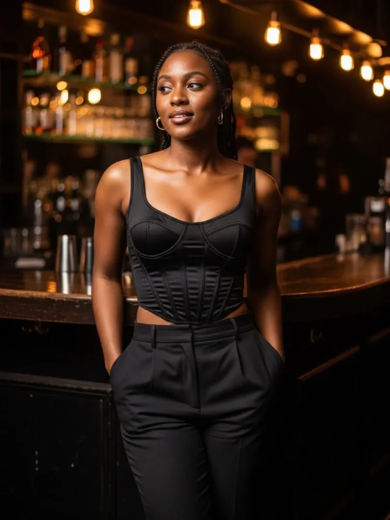 This outfit pairs a structured black corset style top with tailored black pants for a sleek club ready combo. The fitted bodice defines the waist while the relaxed pants keep the look balanced and modern.