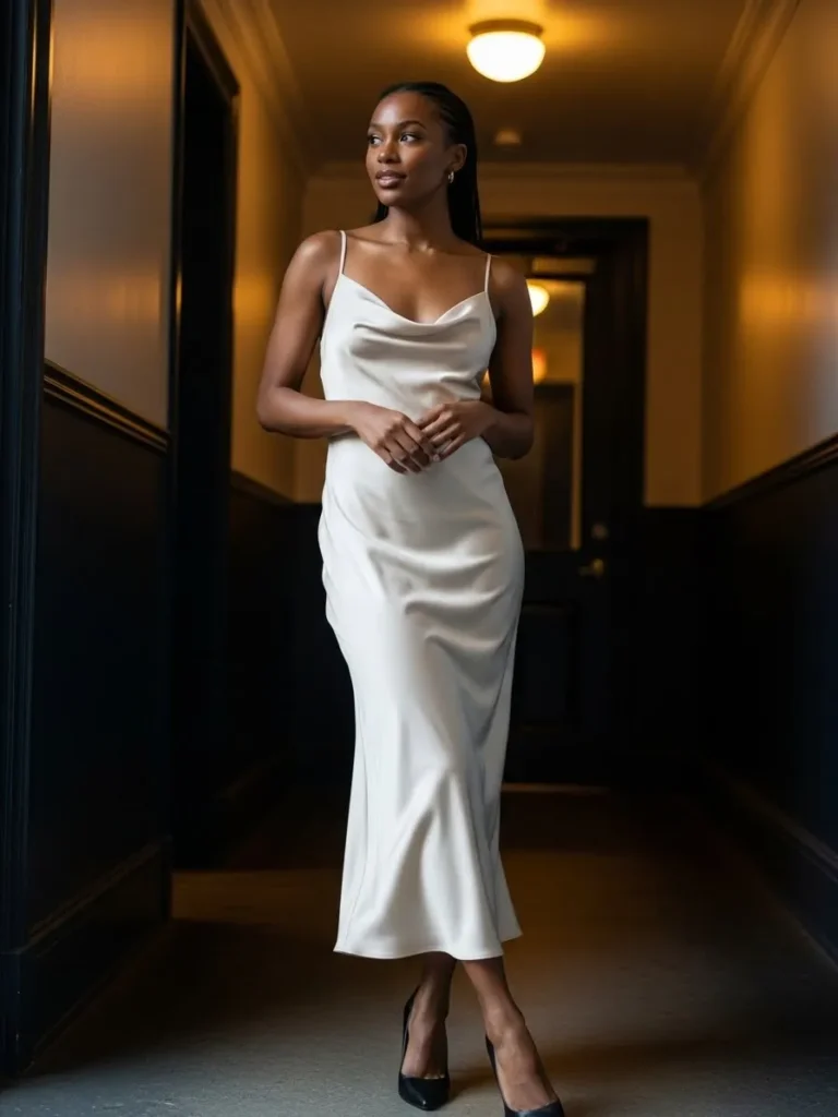 This look features a silky white satin slip dress with delicate straps and a fluid drape that moves beautifully with every step. The glossy fabric and clean silhouette keep things elegant while still feeling subtly sexy and modern.