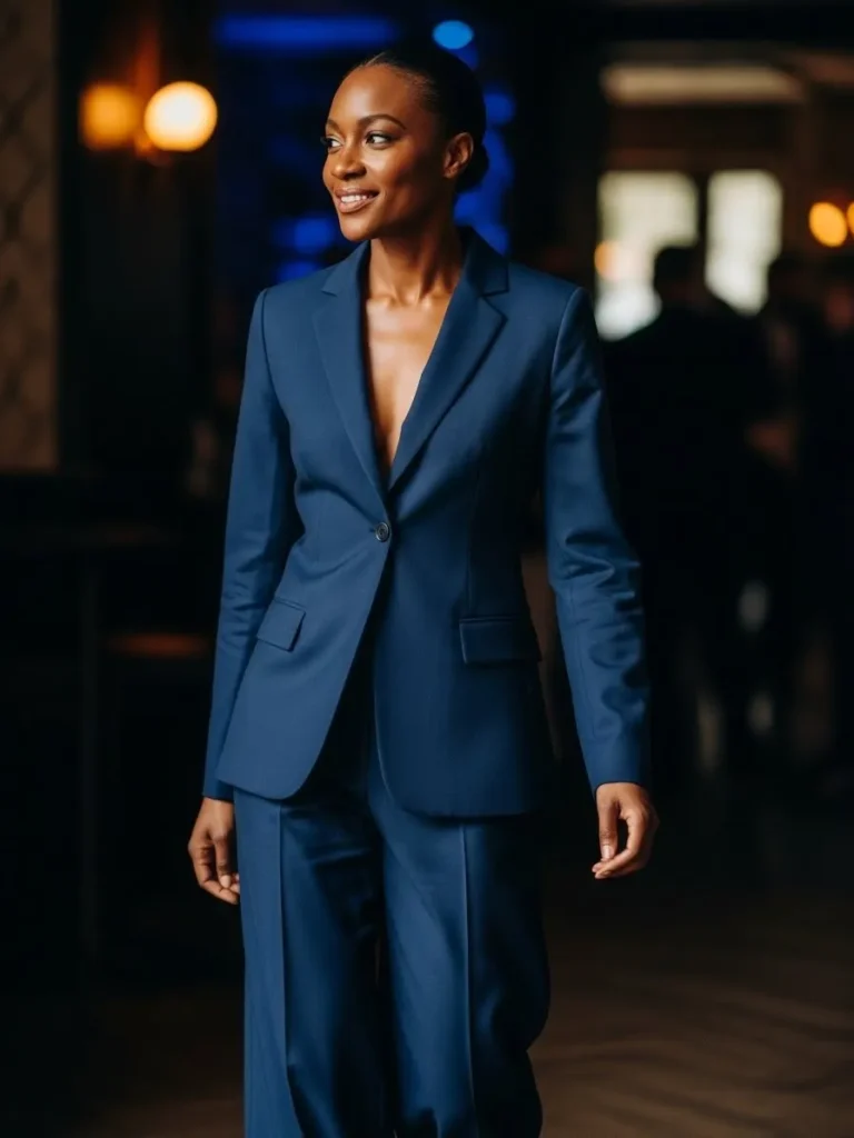 This outfit features a deep blue tailored suit styled with a low neckline for a modern club ready twist. The sharp lines and smooth fabric create a strong silhouette that feels both sexy and sophisticated.