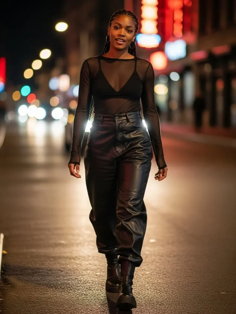 This outfit features a sheer black long sleeve top layered over a bralette paired with high waisted black leather pants and sleek ankle boots. The mix of transparency and leather creates a bold city vibe that feels edgy, confident, and perfect for a night that starts on the street and ends on the dance floor.
