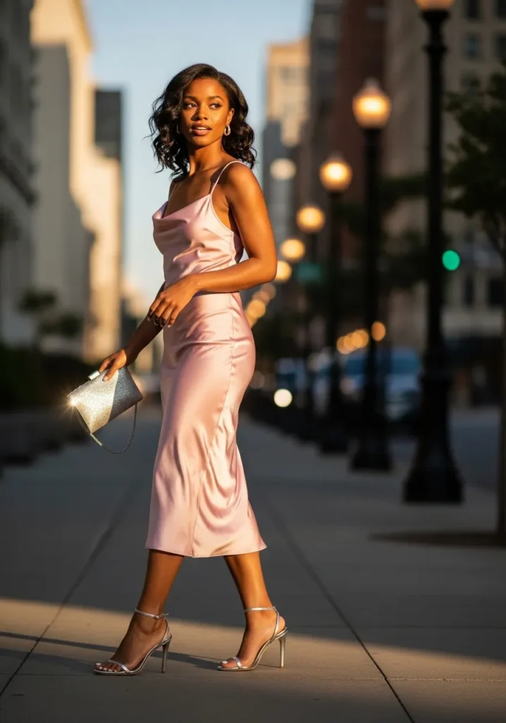 This look features a soft pink satin midi dress that hugs the body in all the right places, finished with thin straps and a subtle sheen that catches the city lights. The fabric flows smoothly with a gentle drape, and the minimal heels keep everything elegant and club ready without feeling overdone.