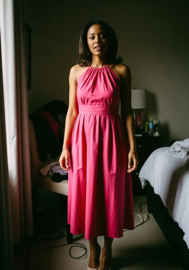 Here we see a halter neck pink midi dress with a gently cinched waist and fluid skirt. The fabric drapes naturally and gives off an effortless glow that works beautifully indoors or under low club lighting.