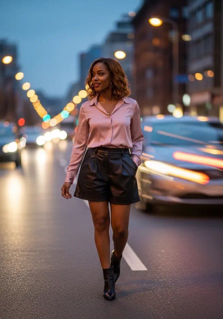 This look mixes a silky pink blouse with high waisted black leather shorts and ankle boots. The shine of the top contrasts with the structured shorts, creating a bold and modern club outfit.