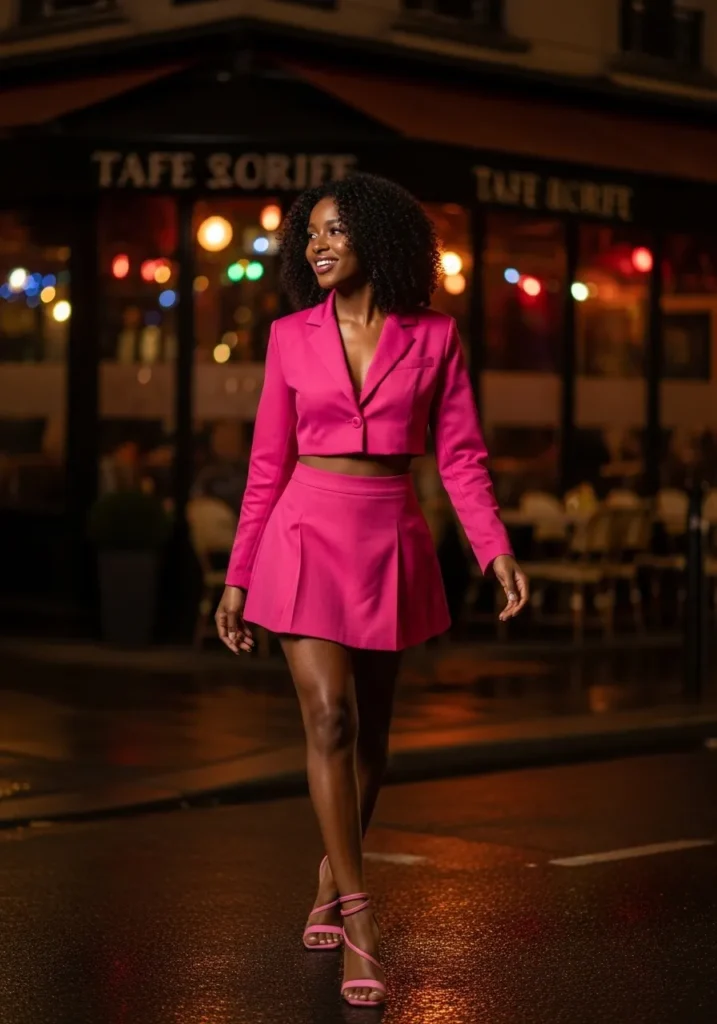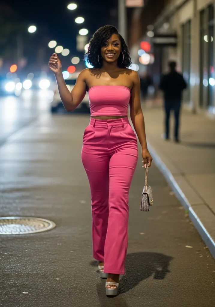 This outfit features a bold hot pink matching set with a fitted top and wide leg pants that elongate the frame. The clean lines and strong color make it stand out beautifully in nighttime settings.