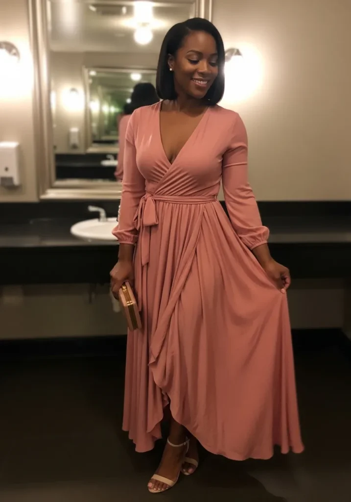 This look shows a wrap style pink maxi dress with a defined waist and flowing skirt. The fabric gathers naturally and creates soft movement that feels elegant and relaxed.