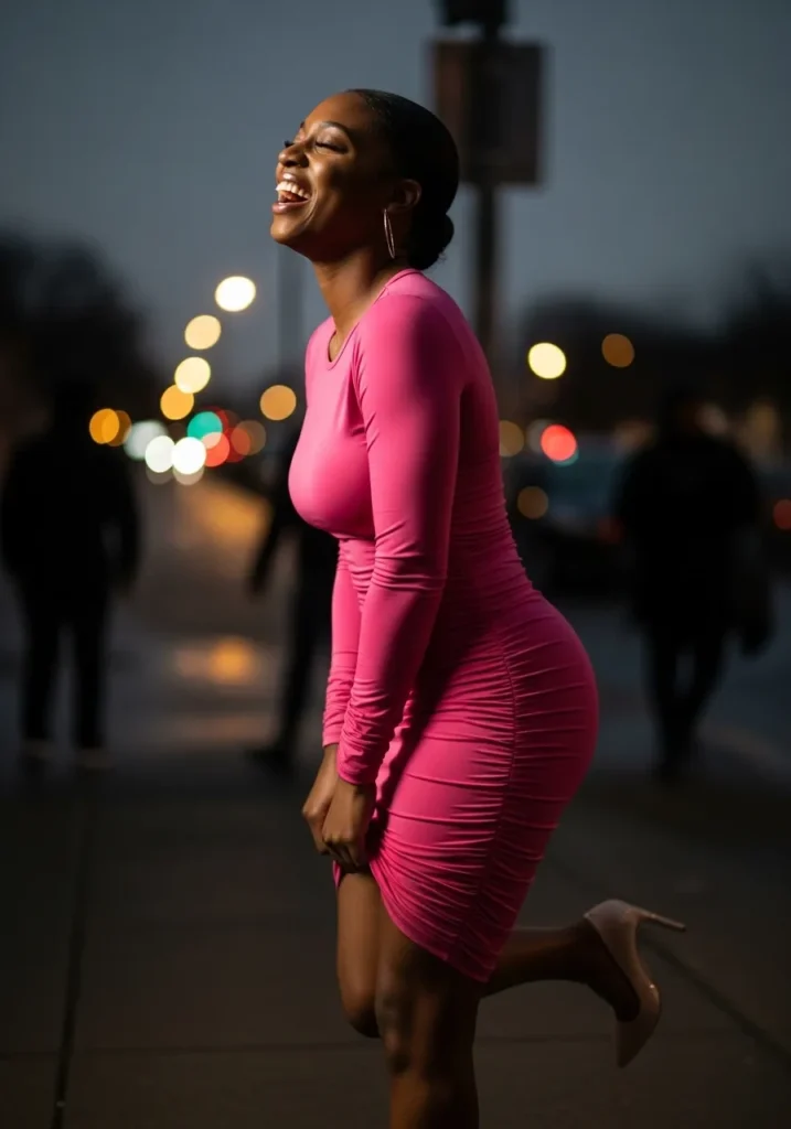 This look showcases a shiny pink mini dress that reflects the lights beautifully, paired with delicate heels. The fitted shape highlights curves while the glossy fabric adds instant nightlife energy.