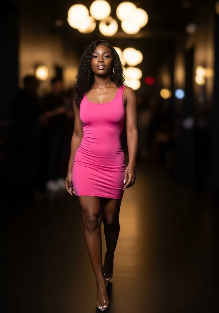 This outfit features a fitted pink bodycon dress that hugs the body from shoulder to hem. The fabric looks smooth with a slight stretch, creating a sleek silhouette that feels perfect for nighttime. The short length keeps it bold, while the rich pink shade pops beautifully against city lights.