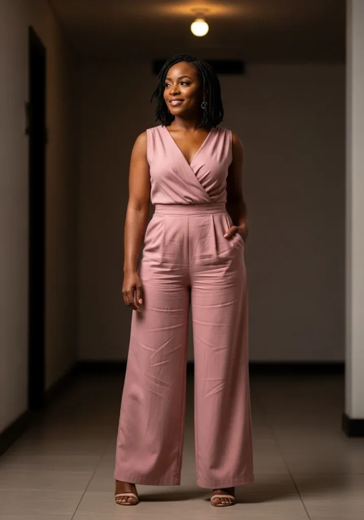A sleeveless blush pink jumpsuit with a relaxed wide leg fit creates a clean and effortless club look. The fabric drapes naturally and the cinched waist keeps the silhouette flattering without feeling tight.