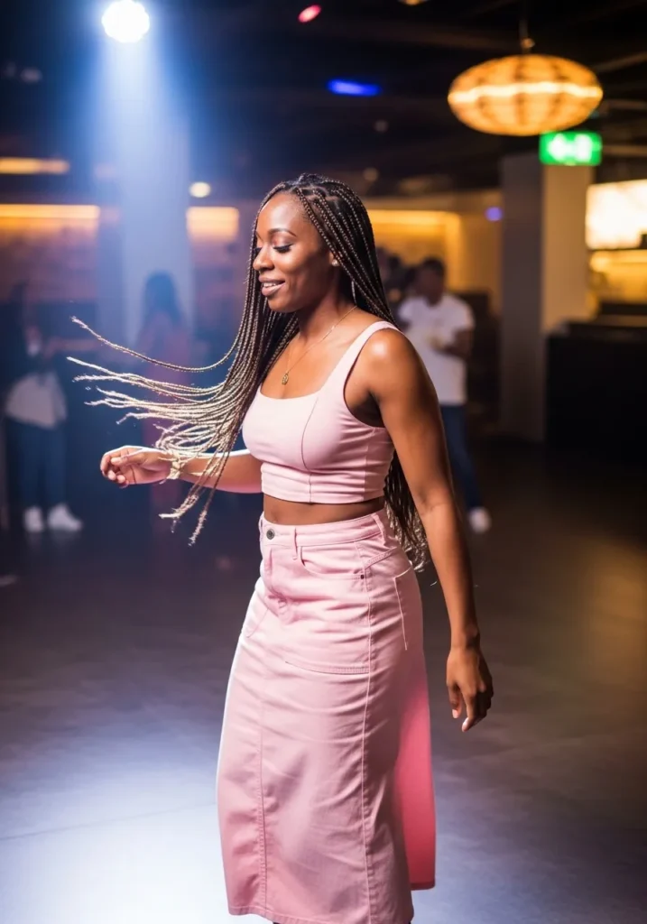 This outfit pairs a fitted pink crop top with a long flowy skirt that moves easily with every step. The fabric looks light and breathable, perfect for dancing, while the high waist keeps the silhouette clean and flattering under club lights.