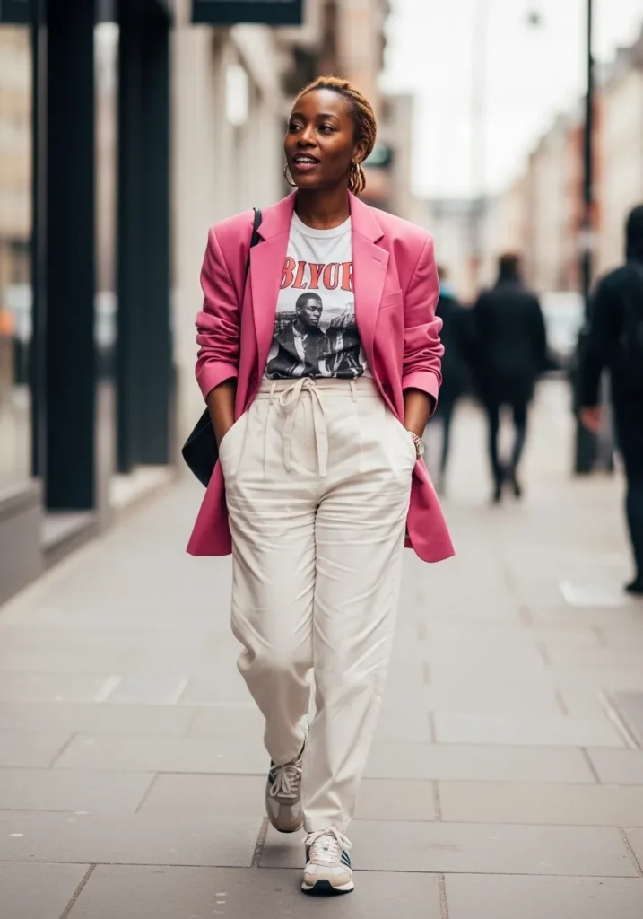 This outfit pairs a bright pink blazer with a casual graphic tee tucked into relaxed white trousers and chunky sneakers.