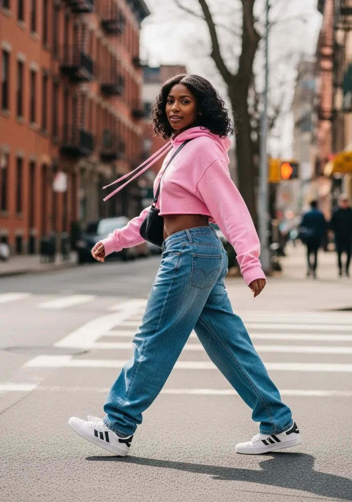 This look pairs a cropped pink hoodie with loose fitting blue jeans and classic sneakers.