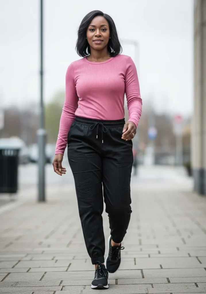 This outfit combines a fitted pink long sleeve top with black jogger pants and sporty sneakers.
