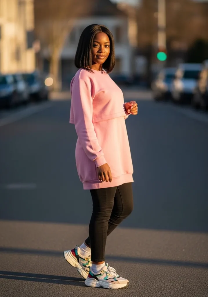 This outfit pairs an oversized pink sweatshirt with black leggings and chunky sneakers.