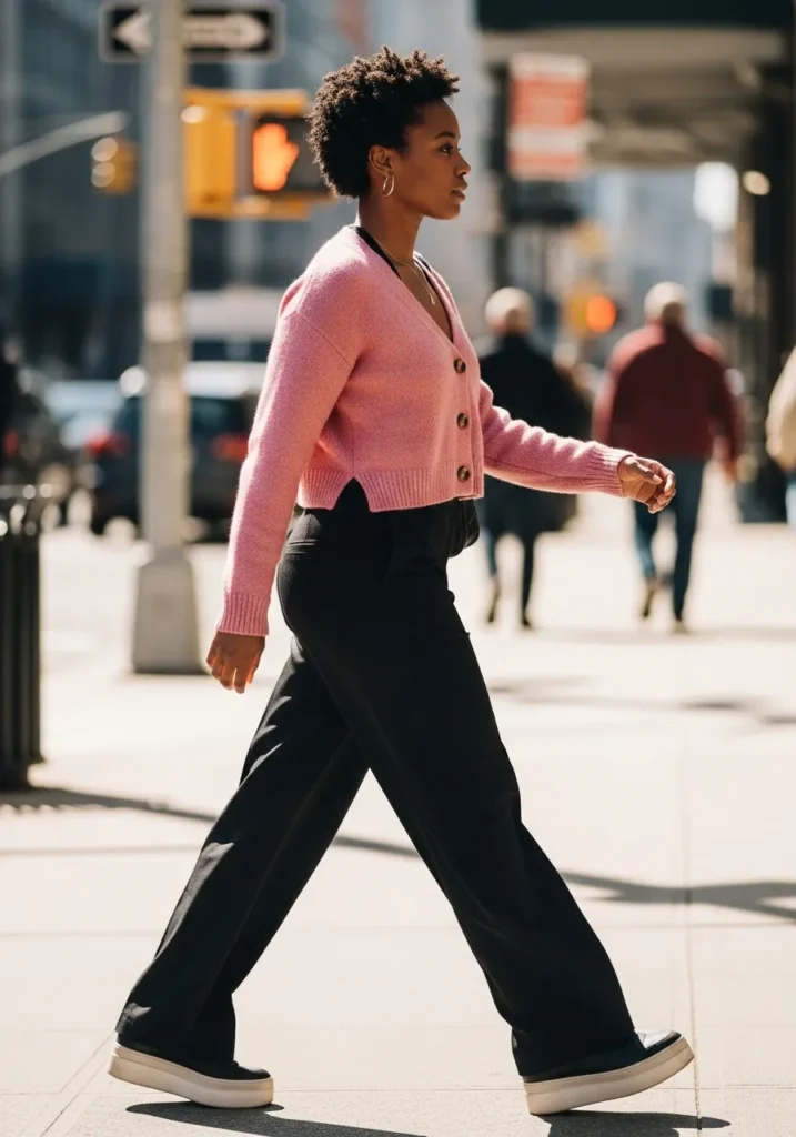 This look combines a cropped pink cardigan with wide leg black pants and sneakers.