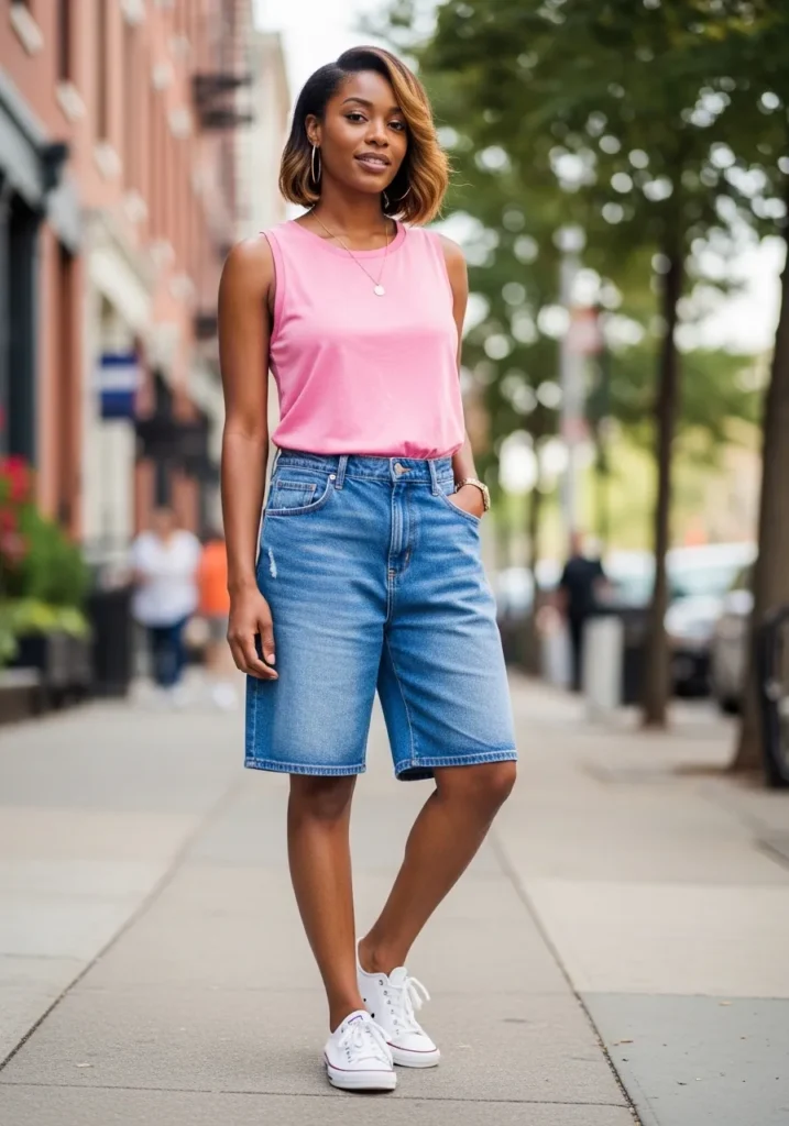 This outfit features a pink tank top paired with denim bermuda shorts and sneakers.