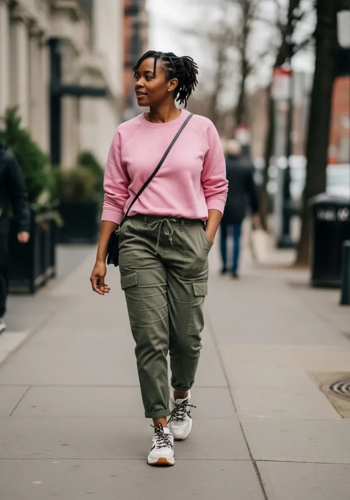 This look pairs a soft pink sweatshirt with olive utility pants and sneakers.