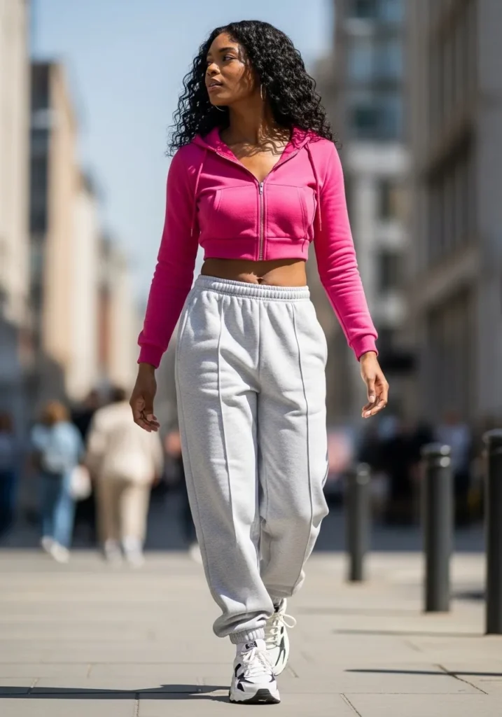This look features a cropped pink zip hoodie styled with loose gray joggers and sneakers.