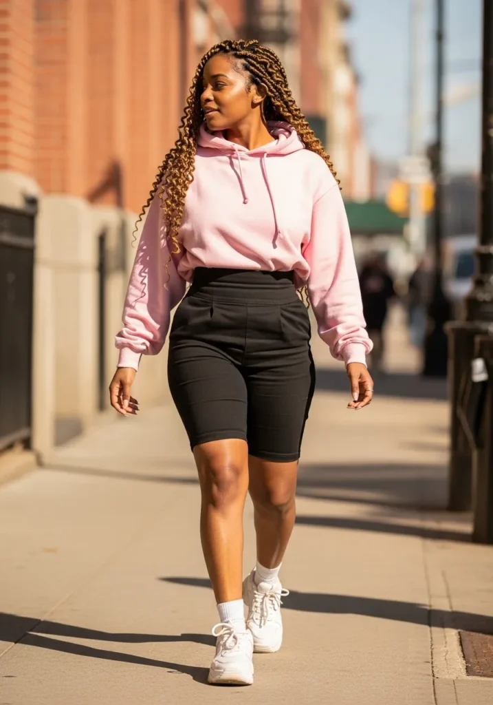 This look features a cropped pink hoodie styled with black biker shorts and white sneakers.