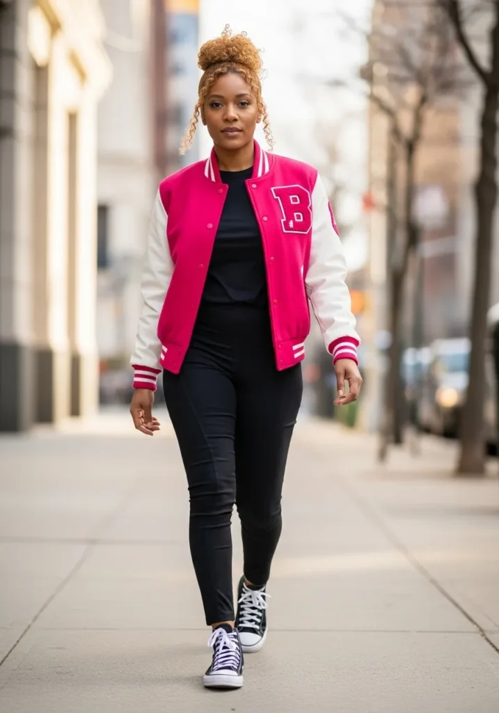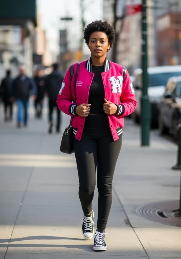 This look pairs a pink varsity jacket with black leggings and classic sneakers.