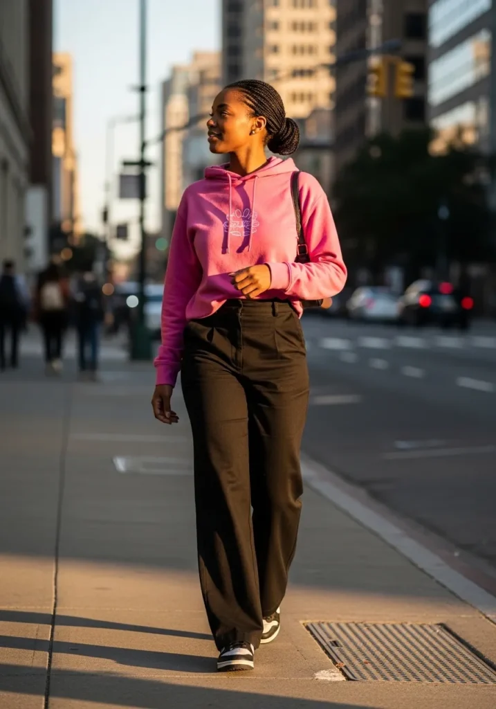 This look pairs a soft pink hoodie with relaxed black tailored pants for that effortless city cool vibe. The hoodie feels cozy and casual with its slightly loose fit and classic drawstring hood, while the structured pants balance things out with a clean, straight leg silhouette. Finished with simple sneakers and minimal accessories, the whole outfit feels modern, comfortable, and perfectly suited for an urban stroll.