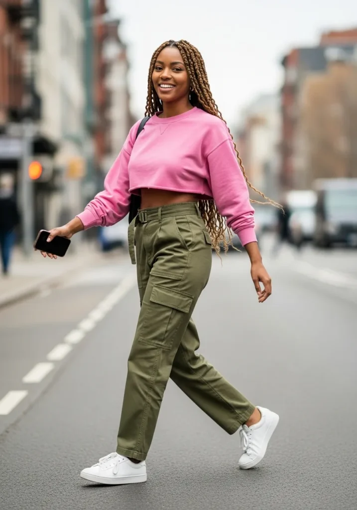 This outfit combines a classic pink sweatshirt with olive green utility pants and clean sneakers.