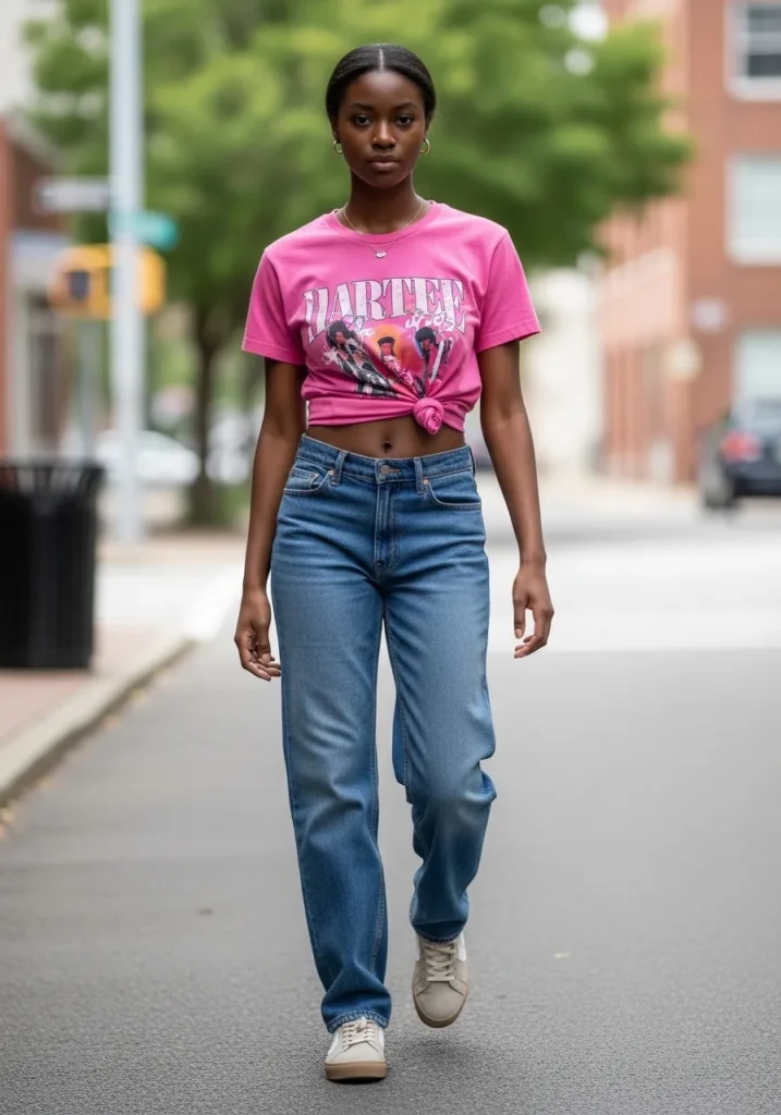 This look pairs a pink graphic T shirt with classic straight leg blue jeans and sneakers.