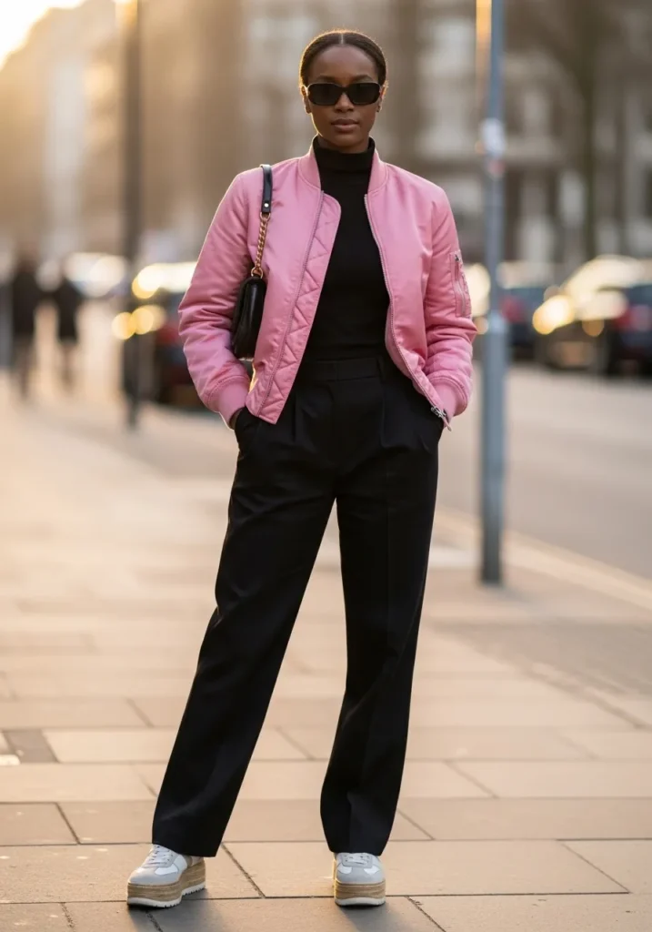 This outfit features a pink bomber jacket layered over a dark top with black relaxed pants and sneakers.