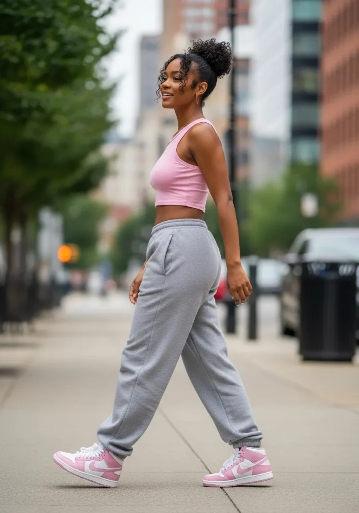 This look pairs a soft pink cropped tank with relaxed gray joggers and pink sneakers.
