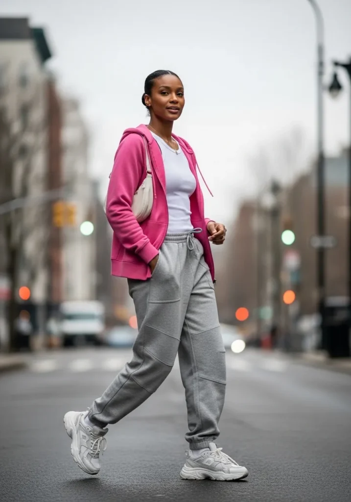 This outfit features a pink zip hoodie layered over a white top with gray joggers and sneakers.