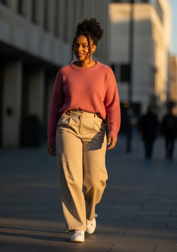The neutral pants let the pink top stand out without feeling loud.
