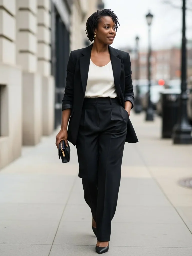 This look is built around a tailored black blazer and matching trousers, paired with a soft cream top underneath. The contrast between black and cream keeps the outfit sharp but approachable. A small clutch and pointed heels complete the look with ease.