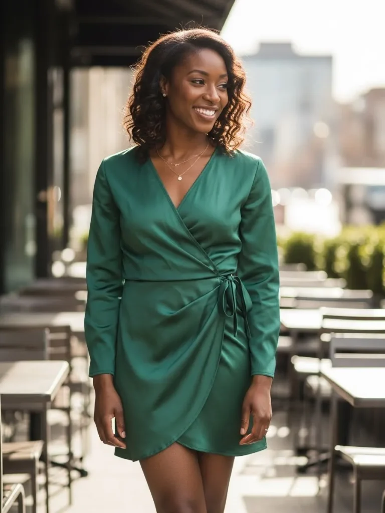 This outfit features a rich emerald green wrap dress with long sleeves and a softly draped skirt that ties at the waist. The V neckline adds a touch of elegance while the smooth fabric keeps the look polished and light. Paired with delicate jewelry, the dress feels perfect for a stylish dinner setting.