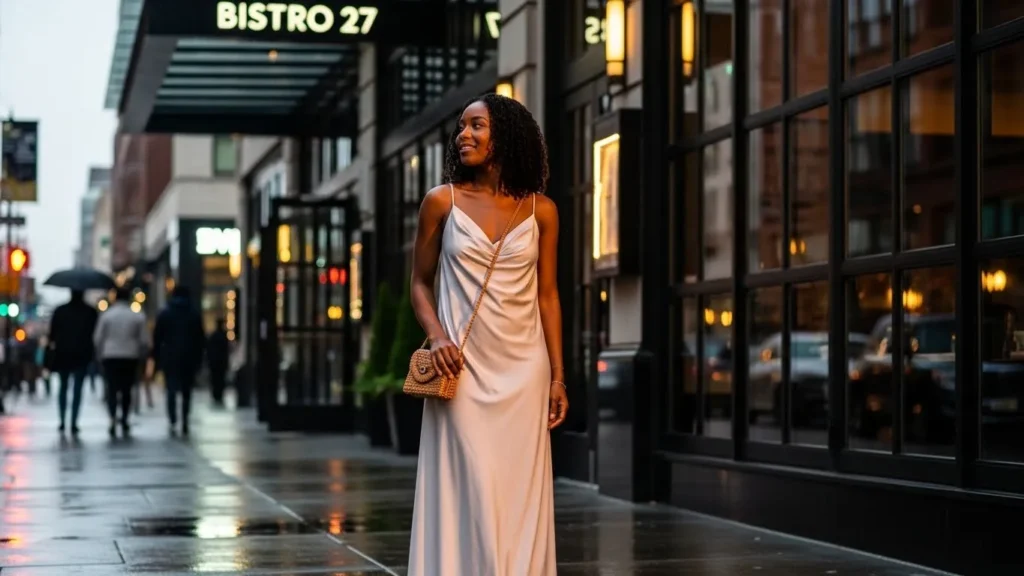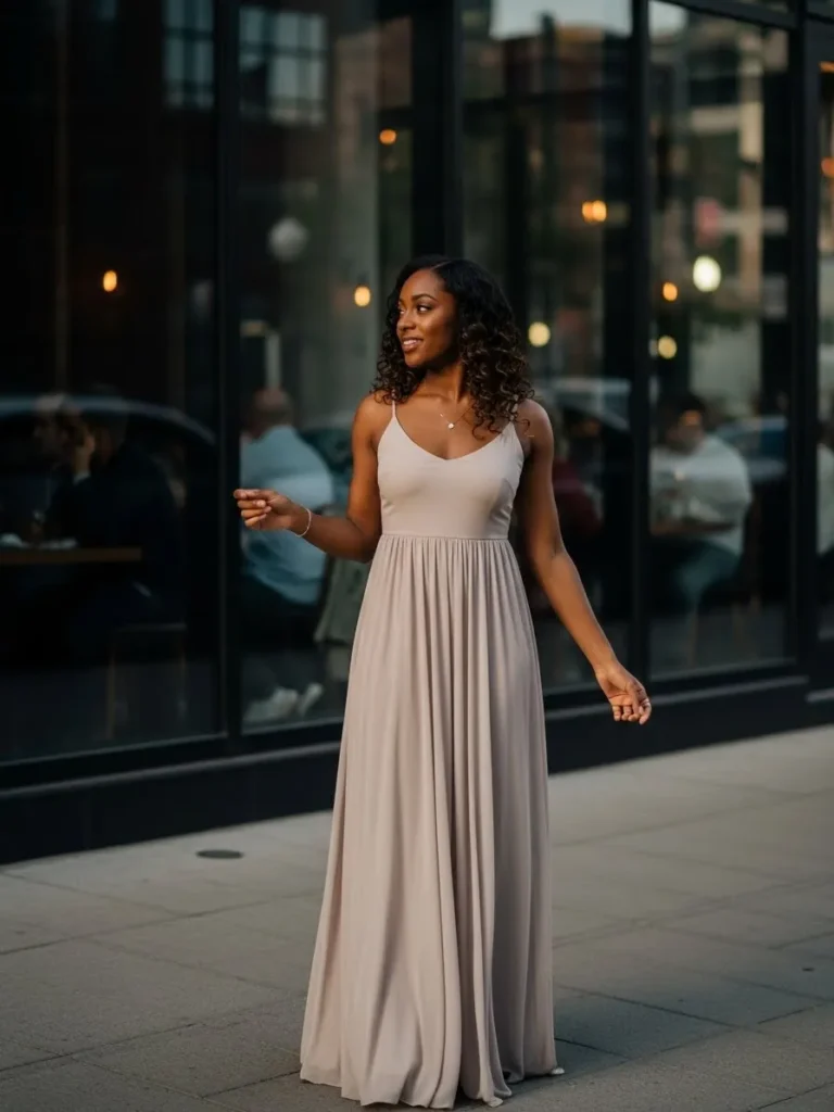 This outfit showcases a soft taupe maxi dress with thin straps and a gently flowing skirt. The silhouette is simple and elegant, letting the fabric move naturally with each step. The neutral tone keeps the look calm and refined for an evening out.