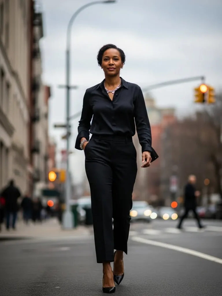 This outfit is built around a sleek black blouse paired with matching tailored black trousers. The clean lines and minimal styling give it a strong and confident feel. Finished with pointed heels and subtle jewelry, it looks sharp and modern.