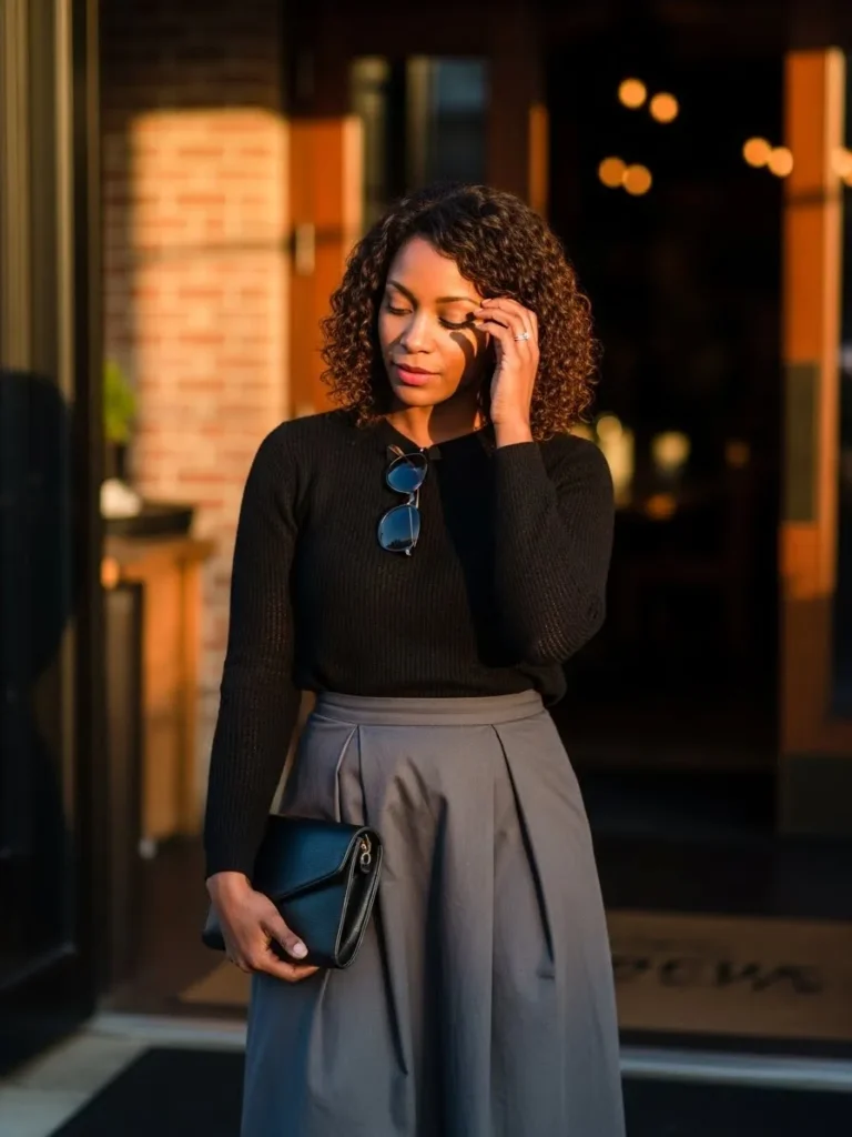 This look combines a fitted black knit top with a flowing gray midi skirt that moves gently as you walk. The contrast between the structured top and softer skirt creates a really balanced silhouette. A small clutch finishes the outfit perfectly.