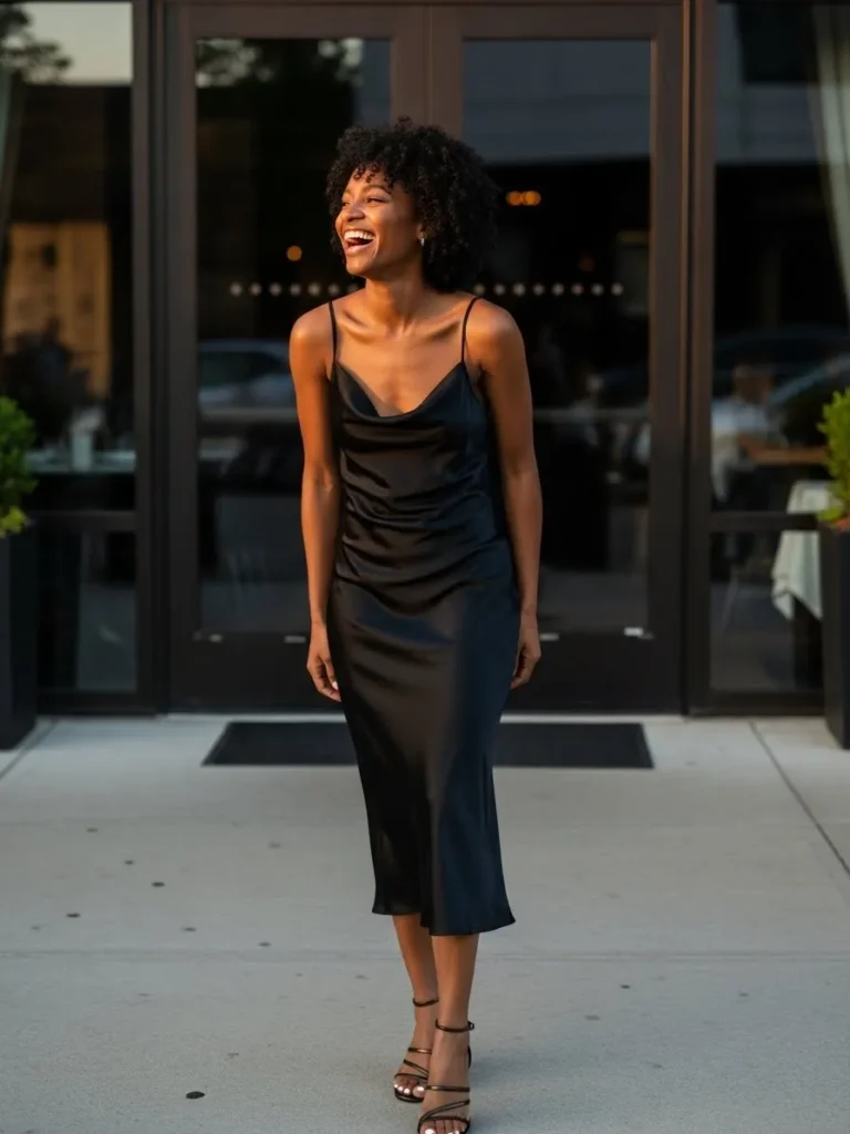 This outfit features a black slip dress with delicate straps and a silky finish that catches the light beautifully. The midi length keeps it elegant while the simple cut lets the fabric shine. Paired with strappy heels, the look feels timeless and refined.
