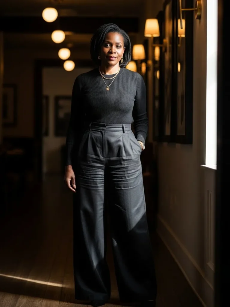This outfit leans into classic black with a fitted ribbed top tucked into high waisted wide leg trousers in a deep charcoal tone. The silhouette is strong but still relaxed, and the subtle jewelry adds just enough glow without stealing attention. The darker color palette gives it a very elegant evening feel.