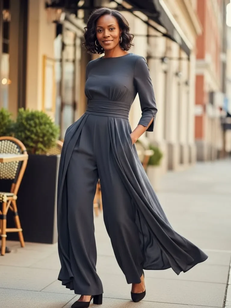 This outfit features a charcoal gray jumpsuit with a softly structured bodice, cinched waist, and wide flowing legs that move beautifully while walking. The three quarter sleeves add balance and polish, while classic black heels keep the look grounded and elegant. The fabric drapes effortlessly, giving the whole outfit a refined yet relaxed dinner vibe.