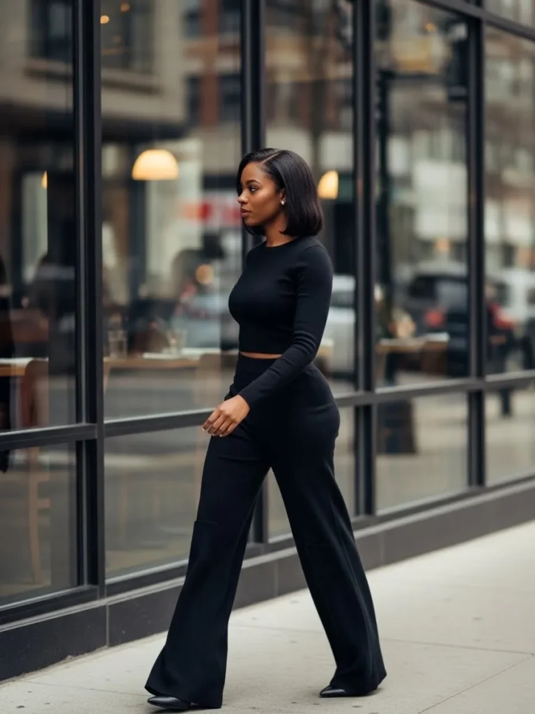 This look is built around a sleek black long sleeve top paired with matching high waisted wide leg pants. The silhouette is streamlined and minimal, creating a very modern and confident feel. The simple styling lets the fit shine, making it perfect for an upscale dinner in the city.